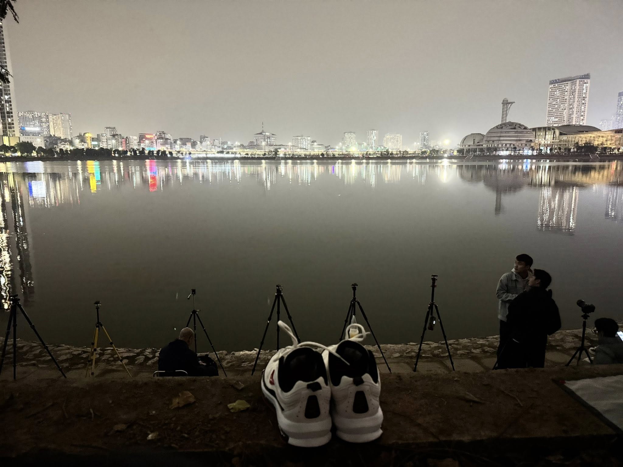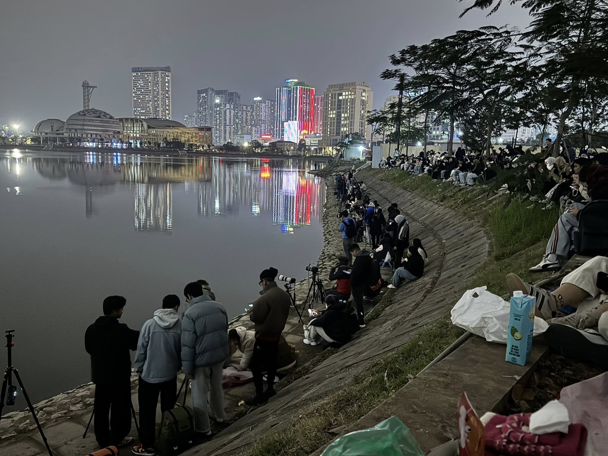 Ngay từ chập tối, các vị trí đẹp xung quanh hồ điều hòa thuộc công viên Cầu Giấy đã chật kín người. Hình ảnh ghi nhận tại hiện trường cho thấy dọc theo bờ kè, hàng loạt chân máy ảnh (tripod) của các nhiếp ảnh gia chuyên nghiệp lẫn nghiệp dư đã được dựng lên từ sớm, xí chỗ "đắc địa" để sẵn sàng ghi lại những khoảnh khắc rực rỡ nhất. Các gia đình, nhóm bạn trẻ và nhiều người dân mang theo cả thảm, ghế xếp và đồ ăn nhẹ, kiên nhẫn ngồi đợi dọc theo các lối đi bộ và bãi cỏ hướng ra mặt hồ, tạo nên một khung cảnh vừa đông đúc vừa trật tự. Ánh đèn từ các tòa nhà cao tầng phản chiếu xuống mặt nước tĩnh lặng càng làm tăng thêm vẻ lung linh, huyền ảo cho không gian chờ đợi.