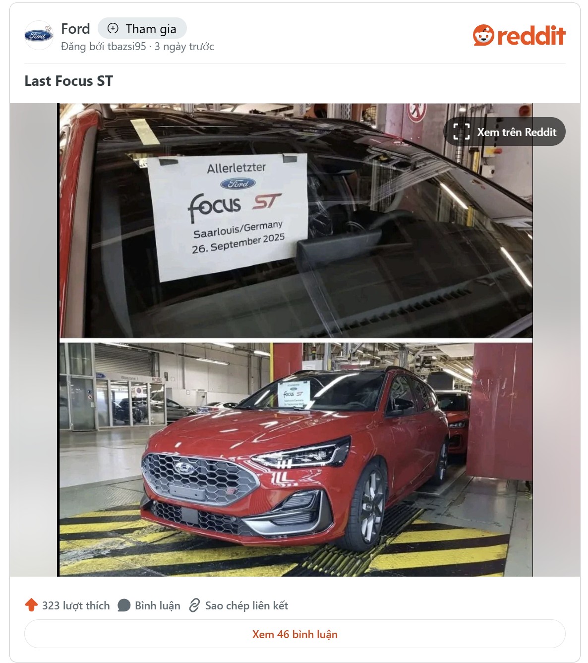 Chiếc Focus ST cuối cùng được hoàn thiện vào ngày 26 tháng 9, theo bức ảnh chụp tại nhà máy Saarlouis của Ford, được đăng tải trên Reddit và chia sẻ bởi Ford Authority. Nhà máy này dự kiến sẽ chấm dứt toàn bộ hoạt động sản xuất vào tháng 11, mặc dù một đội ngũ nhân sự tối thiểu khoảng 1.000 người - ít hơn 3.500 người so với số lượng nhân viên hiện tại của nhà máy - được cho là sẽ ở lại để duy trì hoạt động chờ Ford tìm được đối tác mua lại khu đất.