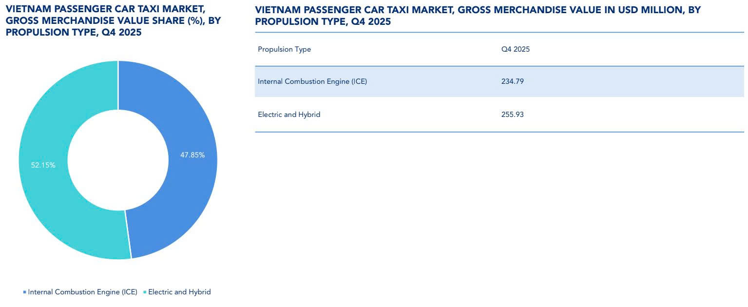 Đáng chú ý, báo cáo của Mordor Intelligence cũng chỉ ra rằng, xe điện và xe hybrid đang dần trở thành loại hình phương tiện chủ đạo trên thị trường taxi chở khách, khi chiếm tới 52,15% lượng xe đang hoạt động taxi tại Việt Nam trong quý IV/2025, trong khi xe động cơ đốt trong chỉ chiếm 47,85%.