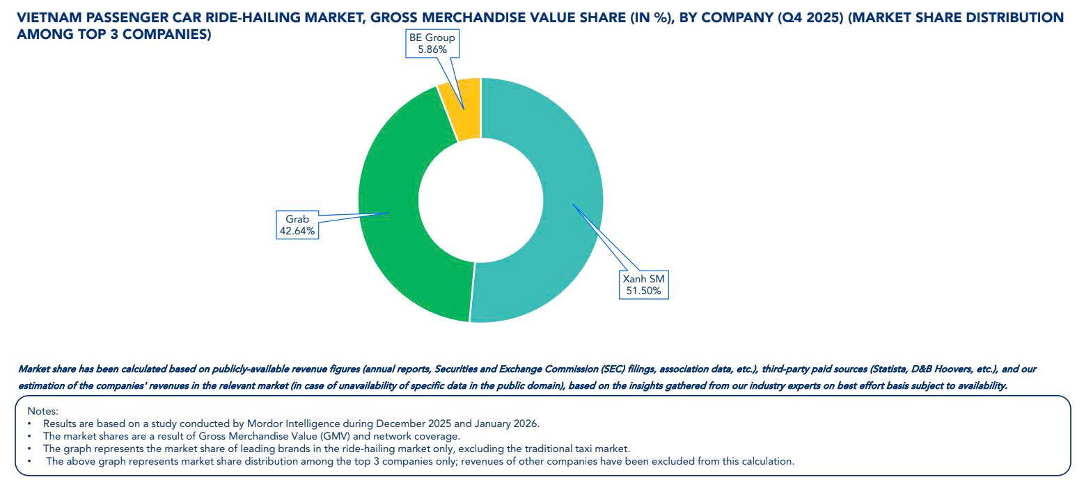 Như vậy, sau khảo sát về mức độ sử dụng thường xuyên các ứng dụng gọi xe tại Việt Nam của công ty nghiên cứu thị trường Q&Me (với kết quả Xanh SM chiếm 52%, Grab 44% và be 4%), báo cáo nghiên cứu thị trường quý IV/2025 của Mordor Intelligence tiếp tục cho thấy Xanh SM đã lần đầu tiên vươn lên chiếm hơn 50% thị phần gọi xe công nghệ tại Việt Nam. Kết quả này cho thấy xu hướng dịch chuyển rõ rệt trong thói quen lựa chọn dịch vụ di chuyển của người dùng, đồng thời khẳng định vị thế của “kỳ lân công nghệ” tiếp theo của Việt Nam.