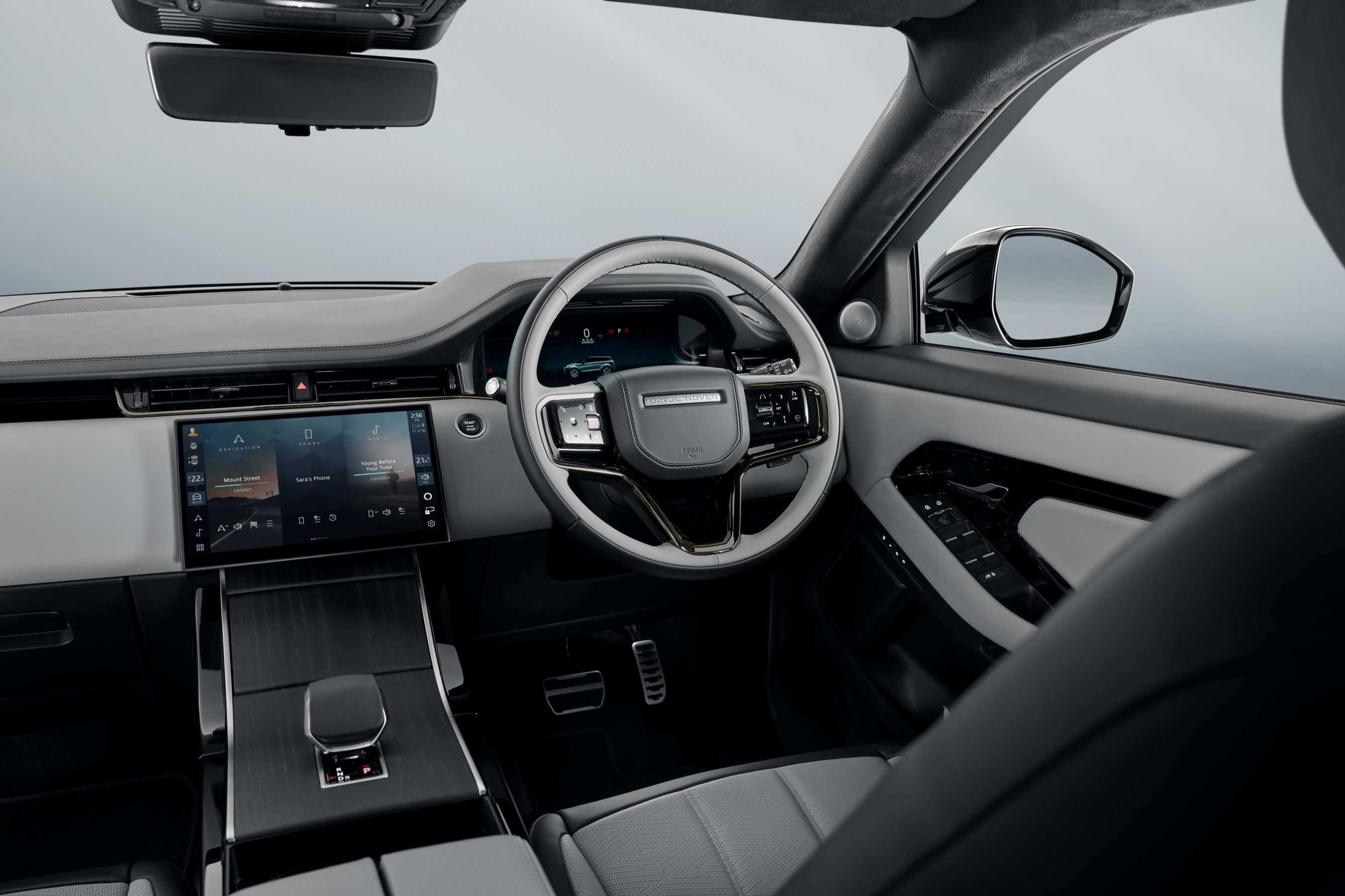 Bên trong khoang cabin, Evoque theo đuổi triết lý thiết kế tối giản với bảng điều khiển trung tâm gọn gàng và màn hình cảm ứng kính cong 11,4 inch đặt nổi.