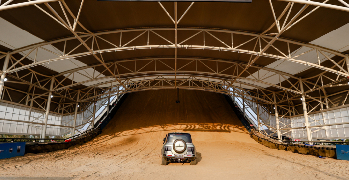 Không chỉ mang đến trải nghiệm lái xe vượt trội, đường đua còn là nơi lý tưởng để trình diễn các công nghệ an toàn trên xe điện (NEV). Khu Kick-Plate mô phỏng điều kiện mặt đường trơn trượt như băng tuyết, giúp người lái cảm nhận phản ứng của xe khi mất lái đột ngột, đồng thời kiểm nghiệm hiệu quả của các hệ thống ổn định thân xe và điều khiển mô-men điện tử.