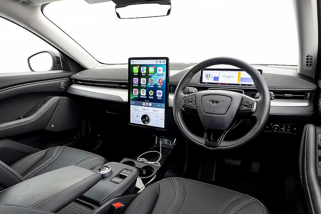 Kết nối không dây liền mạch như Apple CarPlay® và Android Auto™ là trang bị tiêu chuẩn của Mach-E ⁵. Màn hình cảm ứng 15,5 inch Full HD hiển thị thông tin rõ ràng, trực quan; núm xoay vật lý ở phía dưới giúp điều chỉnh âm lượng nhanh chóng và tiện lợi. Bên cạnh đó, sạc không dây cho điện thoại thông minh cũng là trang bị tiêu chuẩn trên tất cả các phiên bản.